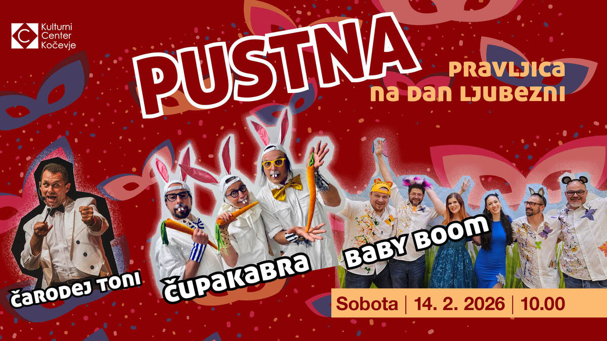 V soboto, 14. februarja 2026, ob 10.00, vse male maškare in njihove starše vabimo v KCK na čarobno pustno dopoldne, polno smeha, glasbe, čarovnije in pravljičnih junakov!