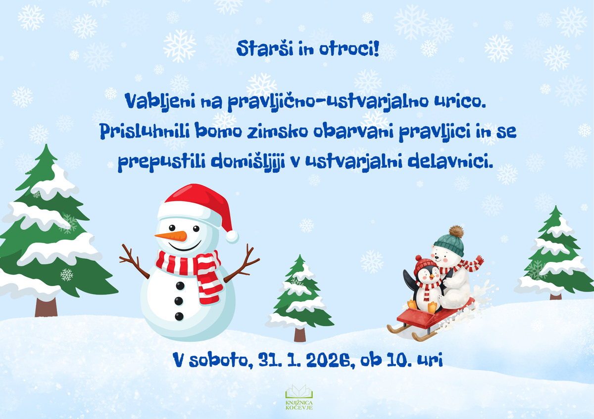 Starši in otroci, vabljeni v Knjižnico Kočevje na pravljično-ustvarjalno urico. Prisluhnili bomo zimsko obarvani pravljici, nato pa domišljiji pustili prosto pot v ustvarjalni delavnici. Pridružite se nam v soboto, 31. januarja, ob 10. uri v Knjižnici Kočevje.