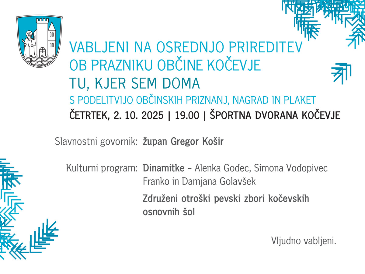 Vabljeni na osrednjo prireditev ob prazniku občine Kočevje Tu, kjer sem doma, s podelitvijo občinskih priznanj, nagrad in plaket.