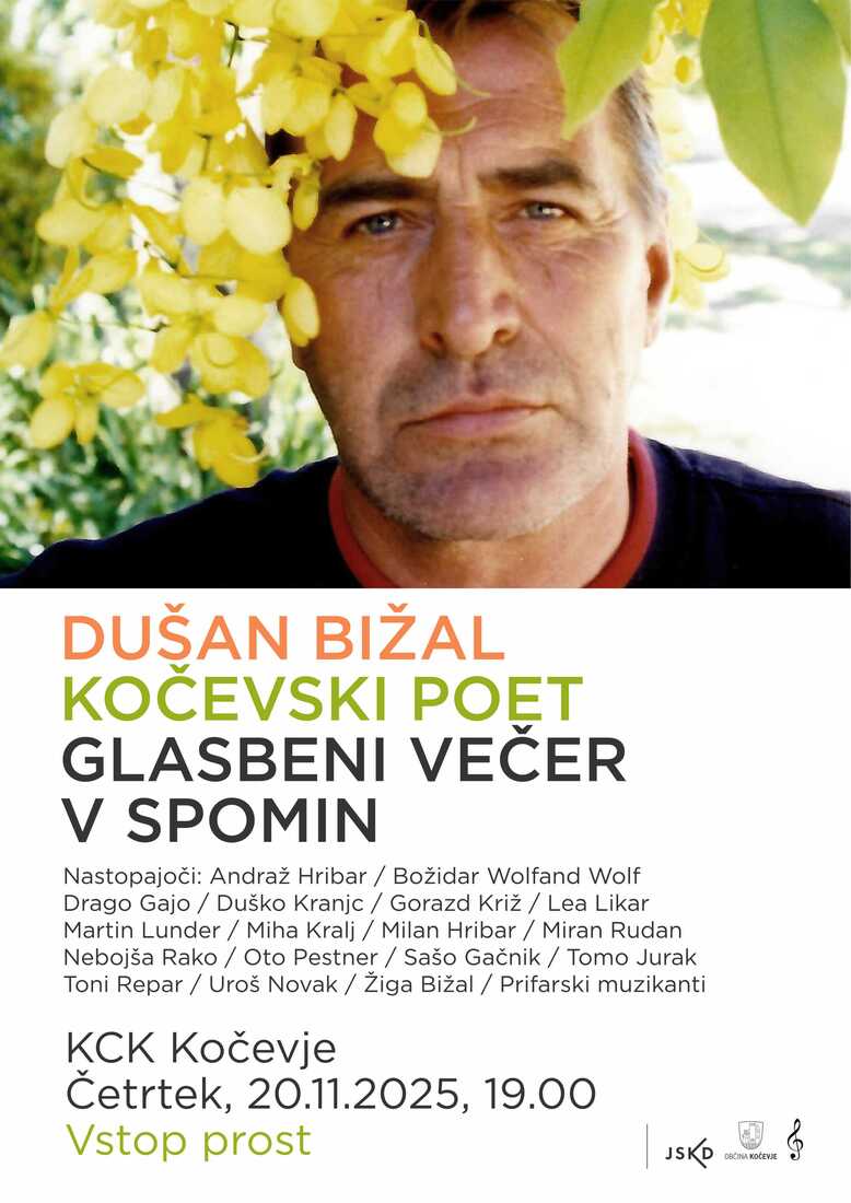 Vabljeni na poseben glasbeni večer v spomin na kočevskega poeta Dušana Bižala, ki bo v četrtek, 20. novembra, ob 19. uri v dvorani Kulturnega centra Kočevje (KCK). Skupaj bomo ob zvokih brezčasnih uspešnic slovenske zabavne glasbe obujali spomine na naša mlada leta ter se prepustili toplim melodijam in iskrenim verzom, ki nas še vedno povezujejo.