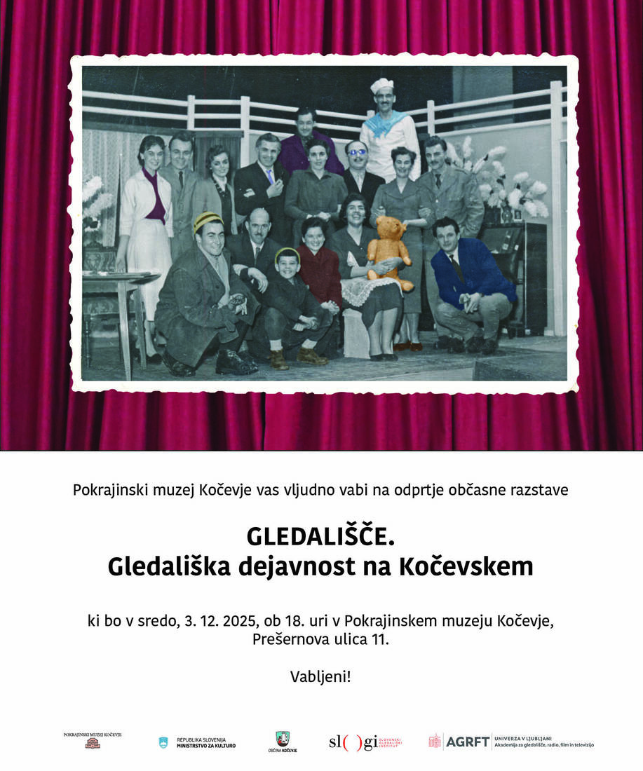 Vabimo vas na odprtje občasne razstave Gledališče. Gledališka dejavnost na Kočevskem, ki bo v sredo 3. decembra 2025, ob 18. uri v Pokrajinskem muzeju Kočevje, Prešernova ulica 11, Kočevje.