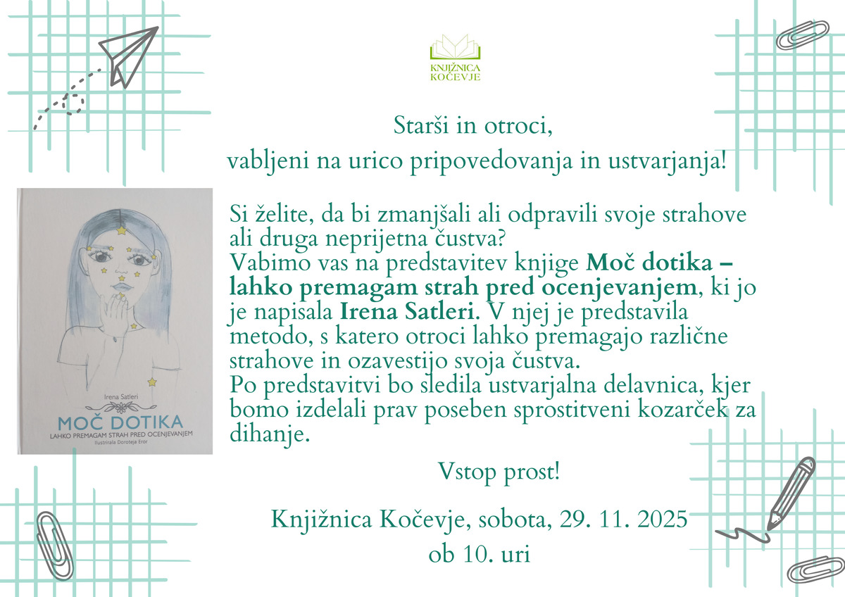 Starši in otroci, vabljeni na urico pripovedovanja in ustvarjanja. Z nami bo Irena Satleri, ki bo predstavila svojo knjigo Moč dotika - lahko premagam strah pred ocenjevanjem. Sledila bo ustvarjalna delavnica.