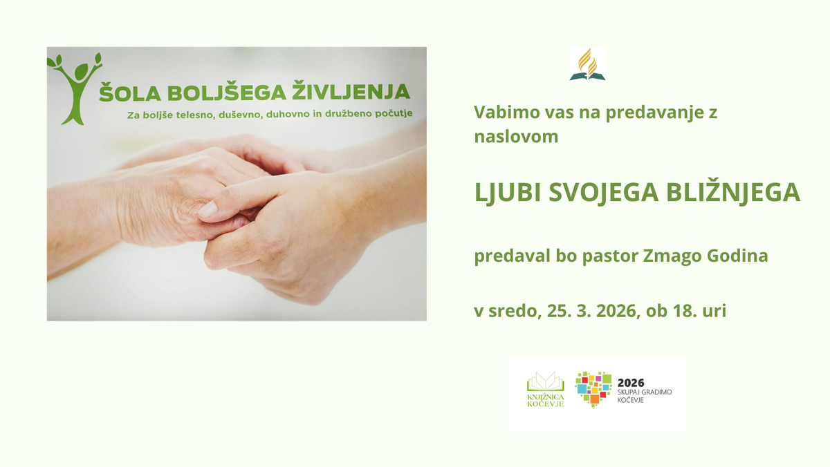 Knjižnica Kočevje vas v sodelovanju s Krščansko adventistično cerkvijo Kočevje v okviru Šole boljšega življenja prijazno vabi na sklop zanimivih predavanj za boljše telesno, duševno, duhovno in družbeno počutje. V sredo, 25. 3. 2026, ob 18. uri nadaljujemo in zaključujemo z naslovom »Ljubi svojega bližnjega«. Predaval bo pastor Zmago Godina.