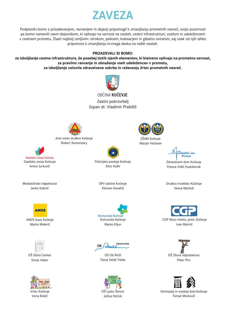 Na Občini Kočevje je danes 18 ustanov oziroma njihovih predstavnikov pristopilo k podpisu zaveze za zmanjšanje števila prometnih nesreč v naši občini. Namen podpisa zaveze je še aktivnejše delovanje in sodelovanje na področju varnosti v prometu. Župan dr. Vladimir Prebilič je kot častni pokrovitelj zaveze ob tem podaril, da je cilj sicer zahteven, a jasen - število žrtev prometnih nesreč zmanjšati na 0.