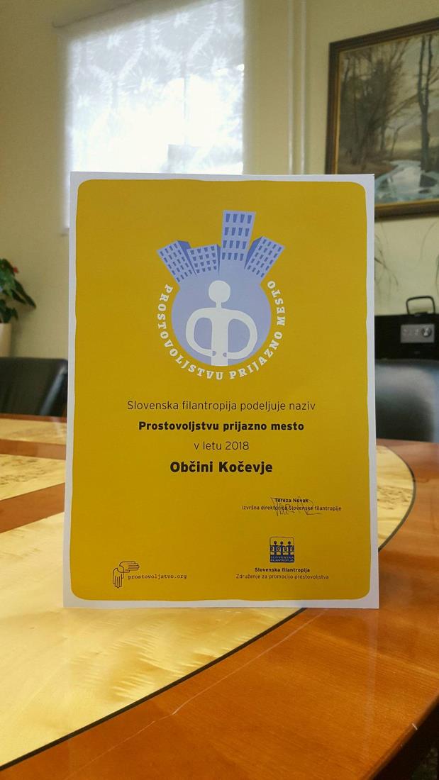 Občina Kočevje je 15. maja ob slovesnem dnevu prostovoljstva, ki poteka v okviru Nacionalnega tedna prostovoljstva, prejela naziv "Prostovoljstvu prijazno mesto".