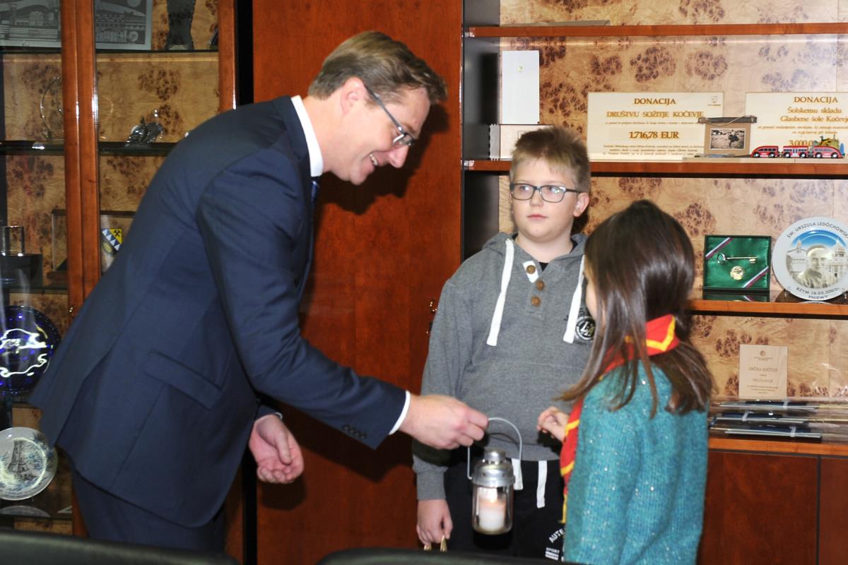 Z zgoraj zapisano poslanico so kočevski taborniki predali Betlehemsko luč županu občine Kočevje dr. Vladimirju Prebiliču.
