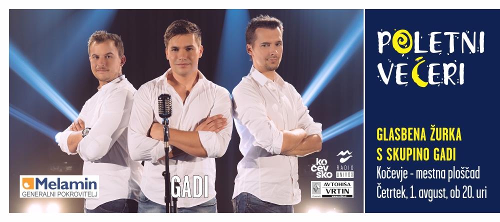 Skupina Gadi ima začetke v letu 2005, za pravi začetek pa šteje leto 2008 s prvimi udeležbami na festivalih, kjer so dosegli nekaj zelo vidnih uspehov na Graški Gori, v Dolenjskih Toplicah, na Vurberku… Sedanji člani Skupine Gadi David Novak, Anže Zavrl in Primož Ilovar sestavljajo prepoznaven trio v narodnozabavni glasbi, njihove pesmi pa si požvižgavajo tako mladi kot starejši. Čeprav gre v osnovi za narodnozabavno zasedbo, so posneli tudi nekaj zabavnih uspešnic.
