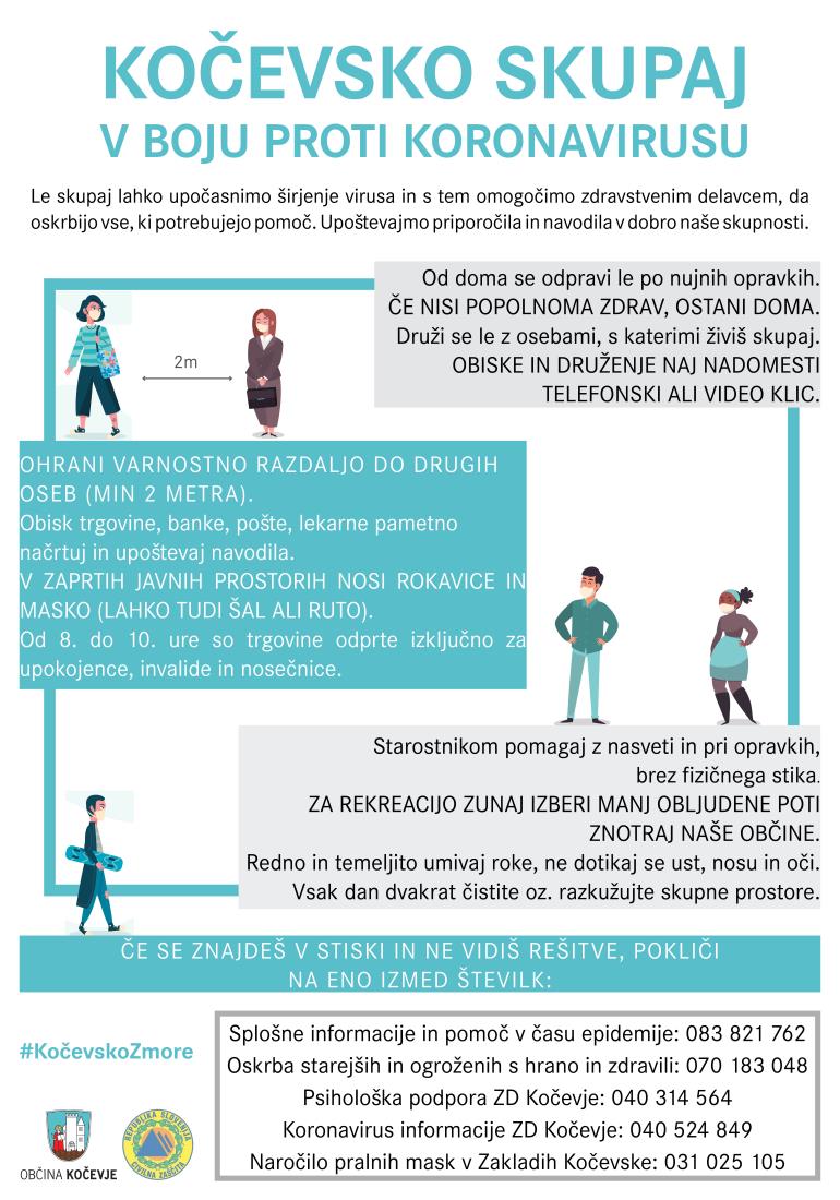 Da bomo vsi v skupnosti obveščeni in poznali ključne veljavne ukrepe ter navodila za zajezitev koronavirusa, smo pripravili plakate, ki jih najdete po oglasnih panojih in deskah. Lahko pa si ga natisnete tudi sami. Hvala, ker sodelujete - skupaj zmoremo!