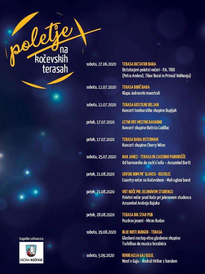 V letošnjem letu bomo v poletnih glasbenih večerih lahko uživali na različnih lokacijah. Skupaj z Zavodom Kočevsko smo se namreč odločili za nov koncept, tako zaradi posledic epidemije novega koronavirusa, kot tudi zaradi želje po več dogodkih oziroma več ponudbe za različne okuse. Na podlagi javnega poziva objavljenega v juniju so se tako lahko gostinski lokali s teraso oziroma zunanjim prostorom prijavili na razpis za organizacijo glasbenega večera z živo glasbo, Občina Kočevje pa bo organizatorjem zagotovila sofinanciranje stroškov. Cilj javnega poziva je tako razširiti turistično zabavne dogodke v poletnem času na celotno občino, na več manjših lokacij, s čimer želimo tudi zmanjšati možnost zbiranja večjega števila ljudi zaradi ukrepov preprečevanja širjenja okužbe Covid-19. Končni cilj javnega poziva je na območju celotne občine Kočevje domačinom in turistom ponuditi raznovrstno ponudbo glasbenih dogodkov na več različnih lokacijah in lokalne ponudnike gostinskih storitev spodbuditi k izvedbi dogodkov.