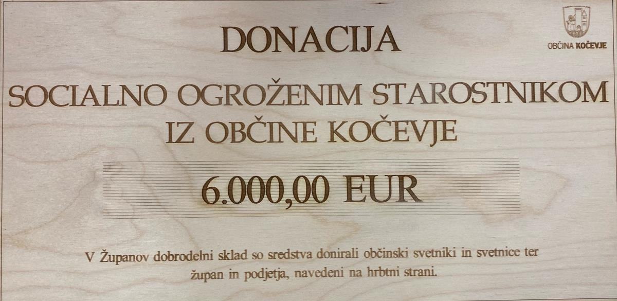 Sredstva bodo iz Županovega dobrodelnega sklada predana območnemu združenju Rdečega Križa Kočevje, ki je skupaj s Centrom za socialno delo poskrbel, da bo donacija v obliki bonov za nakup osnovnih življenjskih potrebščin v vrednosti 60 evrov prišla v prave roke 100 starostnikov na območju kočevske občine. Župan se iskreno zahvaljuje vsem svetnikom in svetnicam ter podjetjem, ki so prispevali letos še toliko bolj potrebna finančna sredstva. Prepričan je, da so starostnikom vsaj nekoliko olajšali in polepšali konec leta, ki je marsikoga postavil pred težke preizkušnje.