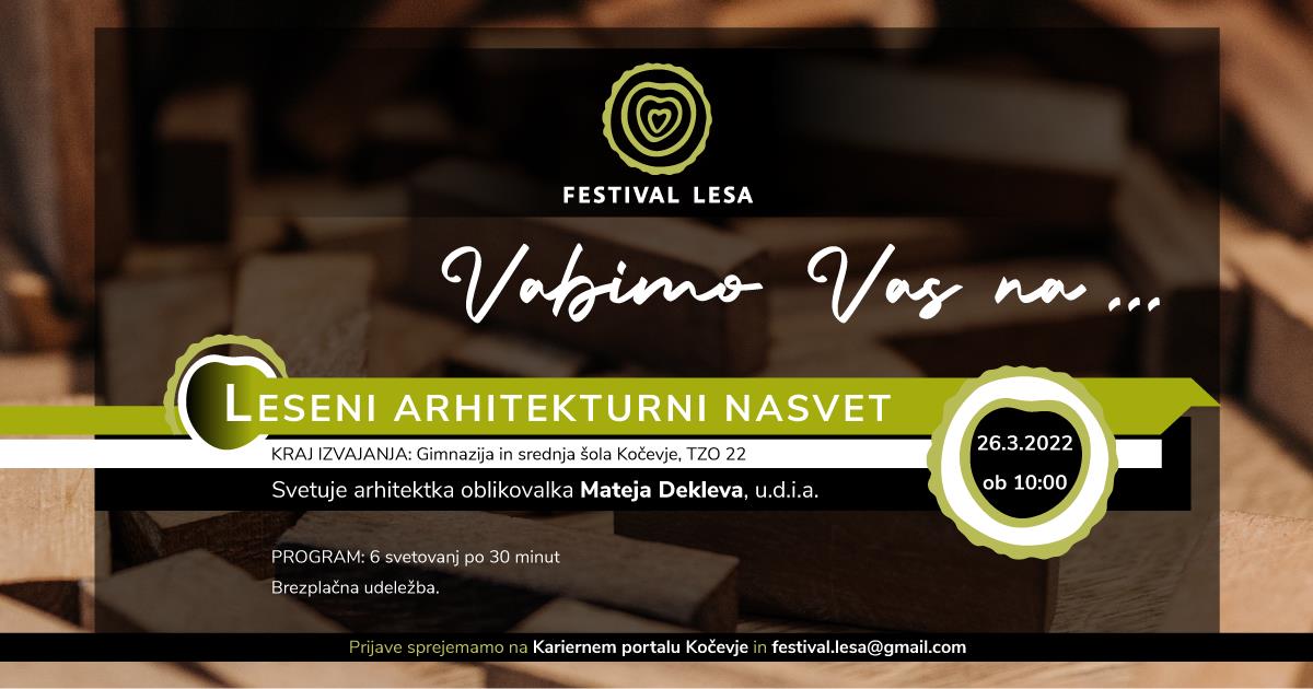 Festival lesa vabi na delavnico Leseni arhitekturni nasvet, ki bo potekala 26. 3. ob 10. uri v prostorih Srednje šole Kočevje. O prenovi ali gradnji lesenih elementov stanovanjskih objektov bo svetovala priznana strokovnjakinja, arhitektka in oblikovalka Mateja Dekleva.