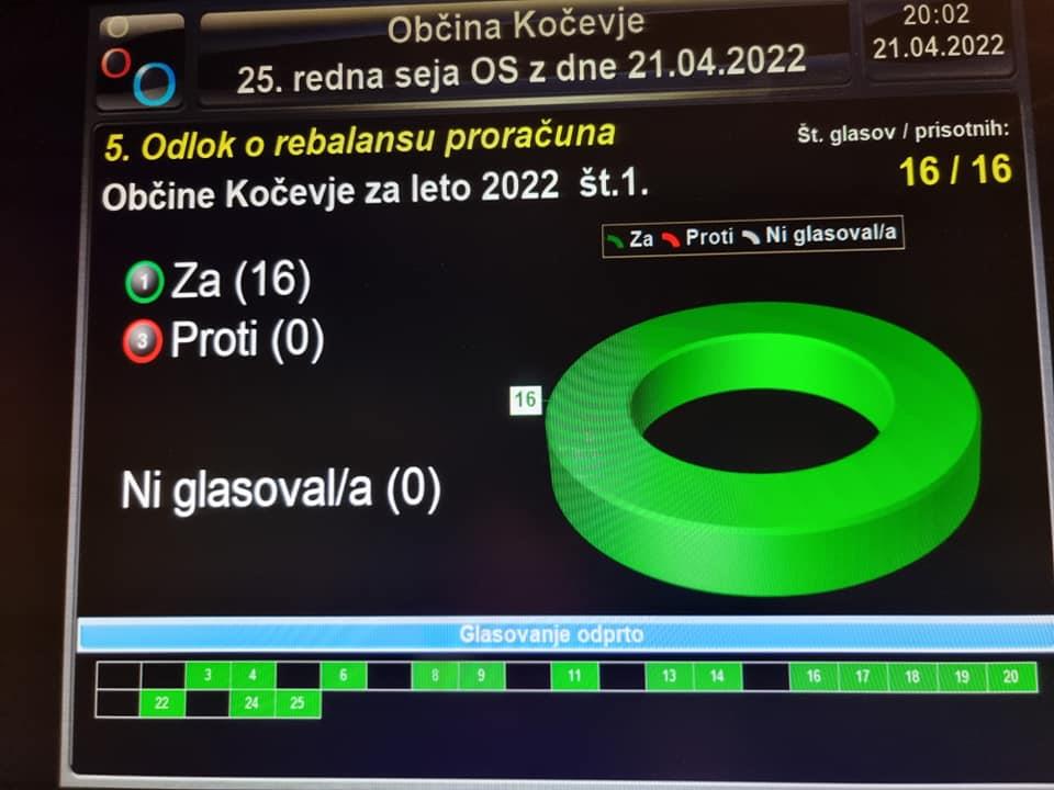 Na 25. redni seji Občinskega sveta občine Kočevje, ki je potekala 21. aprila, je bil ključna točka Odlok o rebalansu proračuna Občine Kočevje za leto 2022 št. 1, ki je bil soglasno sprejet. Pripravljen je bil zaradi pridobitve novih projektov in investicij kot so rekonstrukcije cest in druge infrastrukture v naseljih ter sistema daljinskega ogrevanja. Rebalans proračuna vključuje tudi nove projekte kot so ToyotaGo, prostor za mlade, prohibicijska skupina in izvedba notranje plezalne stene.