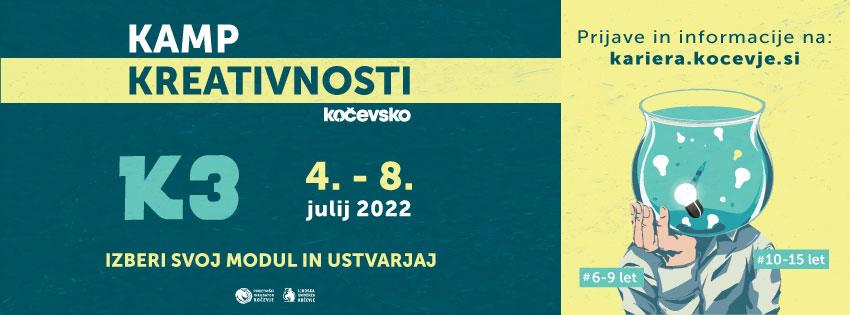 Kamp kreativnosti Kočevsko bo potekal v prvem tednu julija, od 4. do 8. 7. 2022. Na K3 2022 bomo lahko omogočili kreiranje 100-tim mladim, starim med 6 in 15 let.