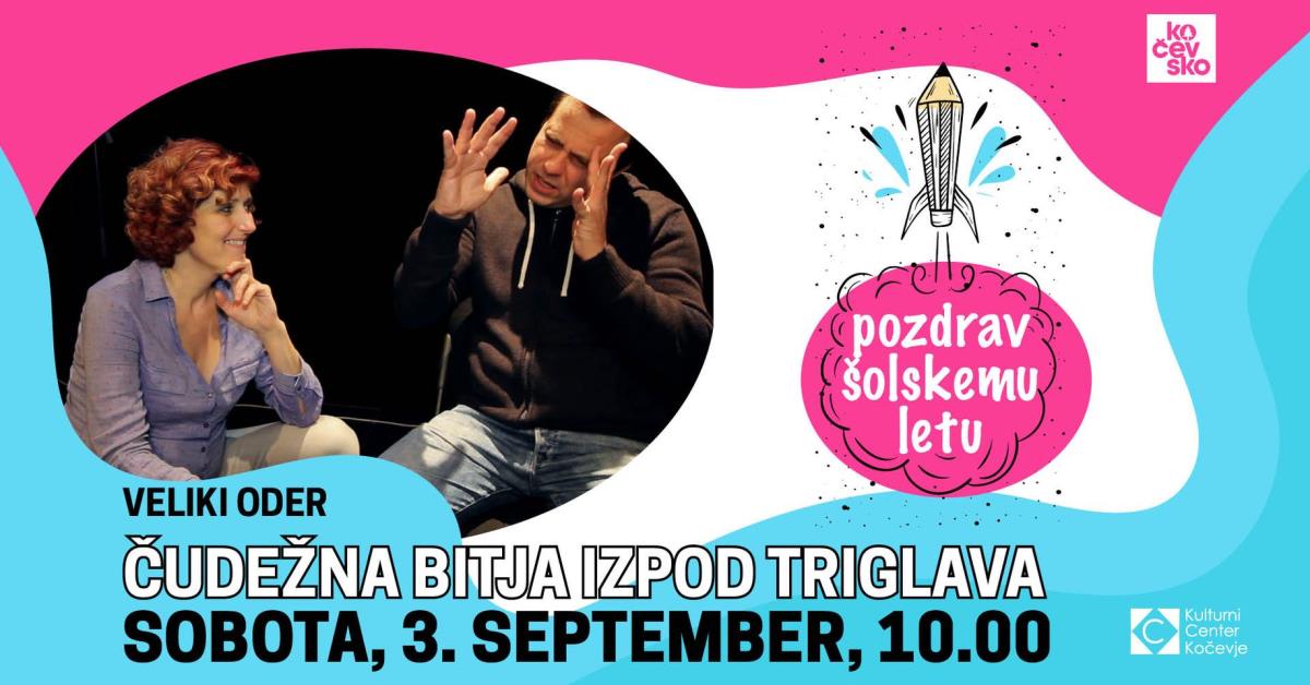 V soboto, 3. septembra, ob 10.00 se bo na Velikem odru na zelenici pri Srednji šoli odvijala gledališka predstava »Čudežna bitja izpod Triglava« za vse otroke in njihove starše - bolj natančno bosta Jelena in Rok uprizorila pripovedovalsko glasbeni bicikel za vožnjo otrok, odraslih in mešanih, saj sta se zakopala v ljudske motive s področja Julijskih Alp, jih izpostavila časovnim zankam, jih zdrobila, razdrla in na novo sestavila. Za vas, za nas.