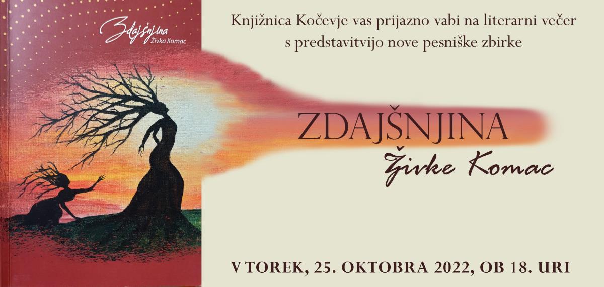 V torek, 25. oktobra 2022, vas Knjižnica Kočevje ob 18. uri prijazno vabi na literarni večer s predstavitvijo nove pesniške zbirke Živke Komac z naslovom Zdajšnjina.