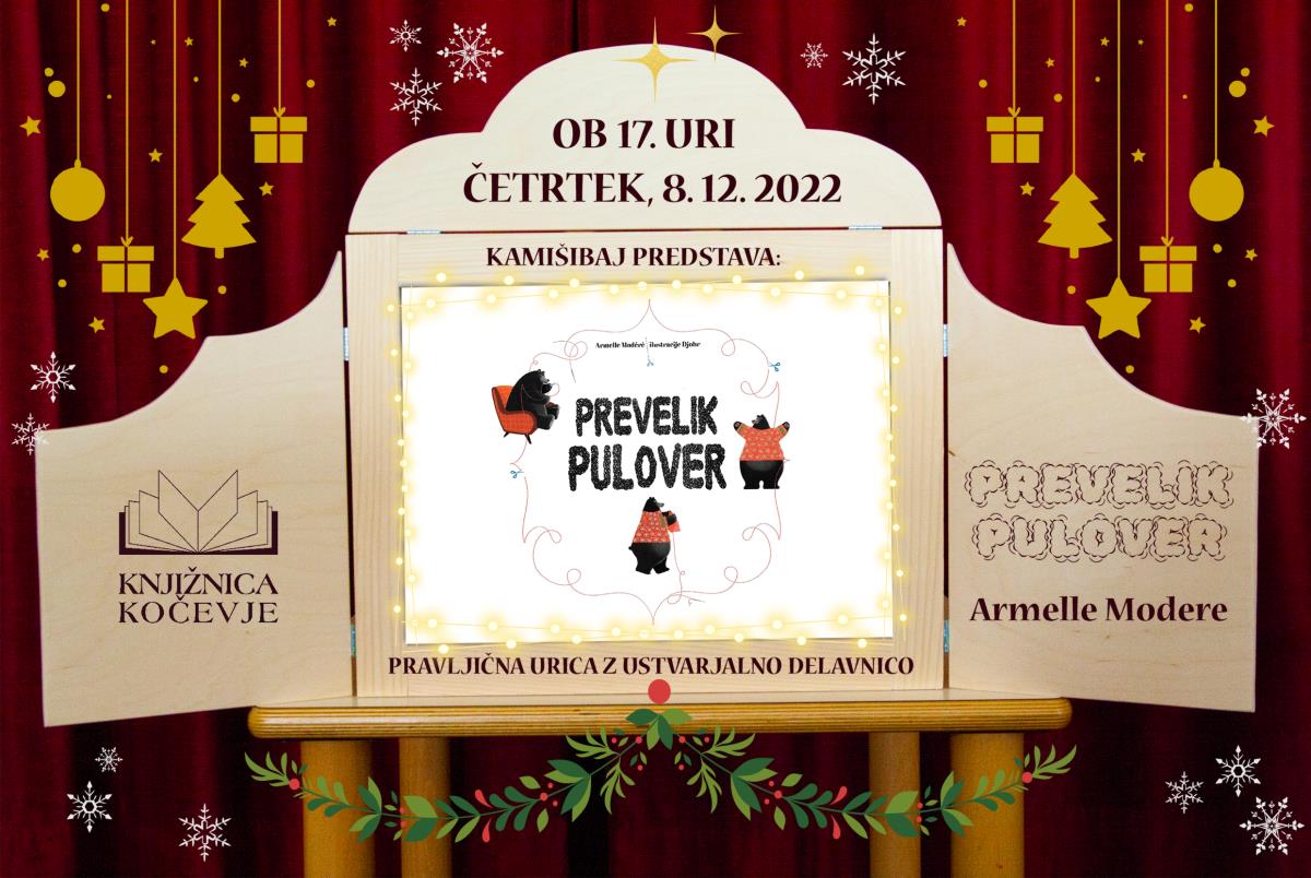 S pomočjo butaja, odra za japonsko gledališče kamišibaj, bomo ob ogledu prisrčnih ilustracij spoznali božično zgodbico Armelle Modere o medvedu s prevelikim puloverjem.Po pravljici Prevelik pulover bo sledilo ustvarjanje unikatnih pisanih papirnatih božičnih puloverjev.