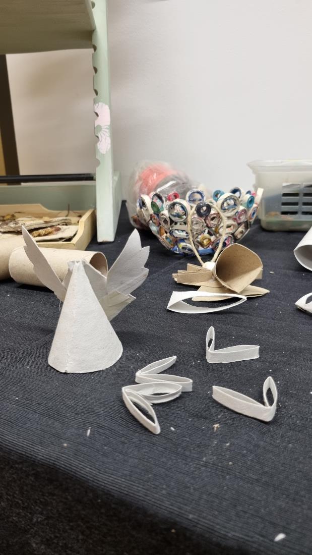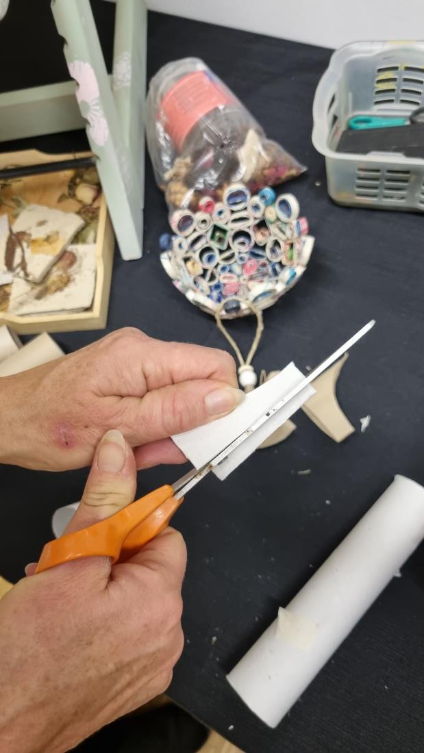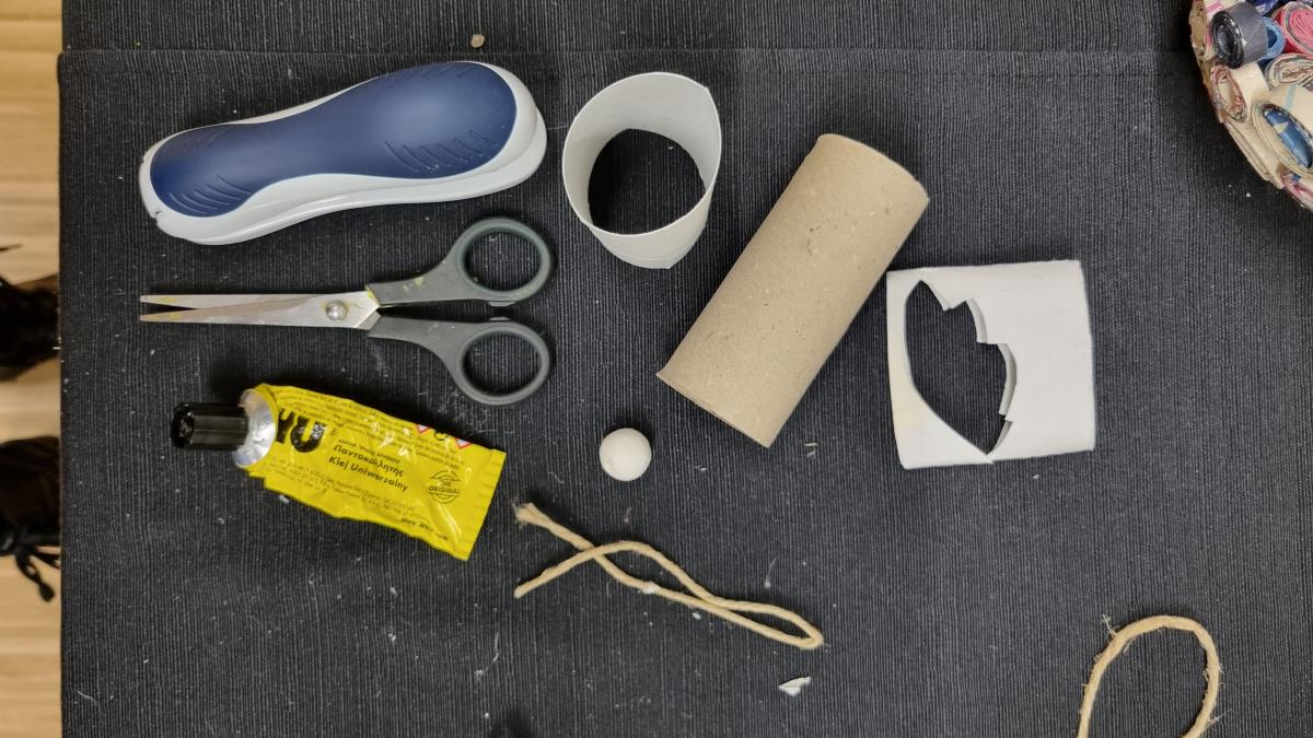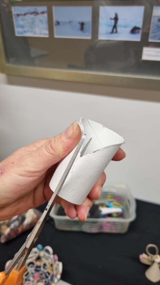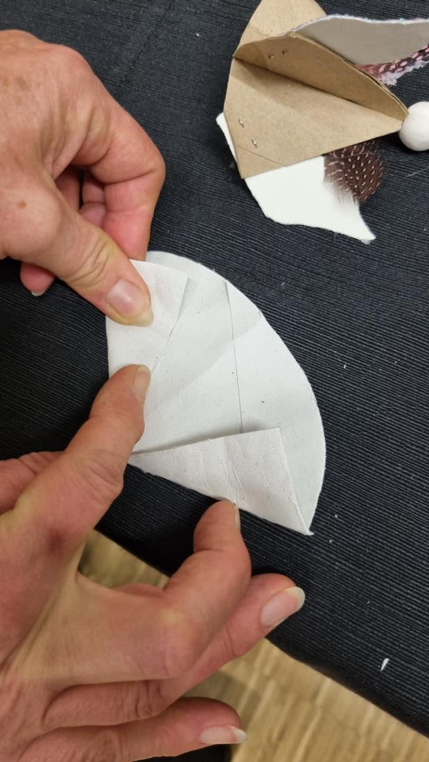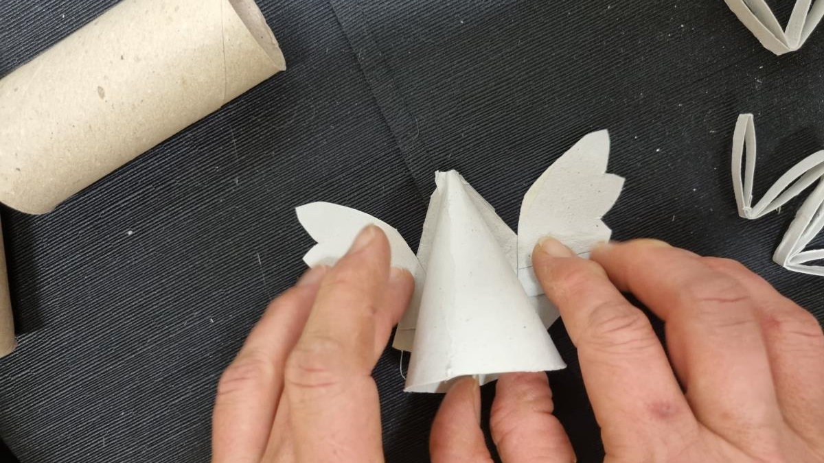 - Izrežite stožec iz papirnate rolice, prerežite in nato zlepite ali spnite tako, da ostanejo majhni zavihki za pritrditev krilc.