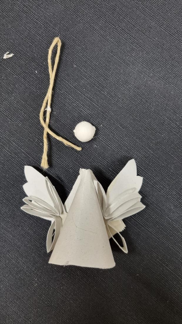 - Iz mase, testa ali papirja z lepilom izdelajte kroglico z luknjo za vrvico. Pritrdite jo na stožec oziroma telo.