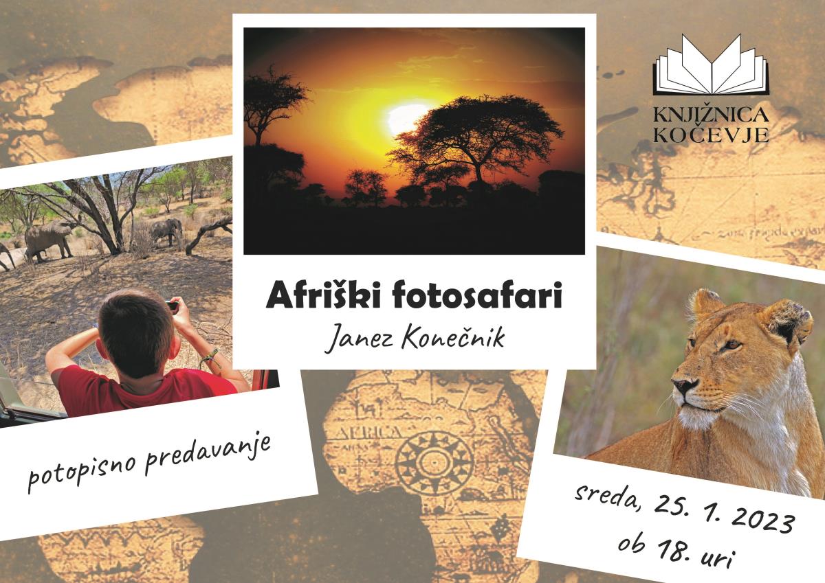 Knjižnica Kočevje vas v sredo, 25. januarja 2023, ob 18. uri lepo vabi na potopisno predavanje Janeza Konečnika o afriškem fotosafariju. Naš someščan nas bo popeljal po čudoviti divjini Tanzanije in nam predstavil veliki pomen turizma za to daljno deželo in njene prebivalce ter programe za opazovanje divjih živali, ki jih ponujajo.