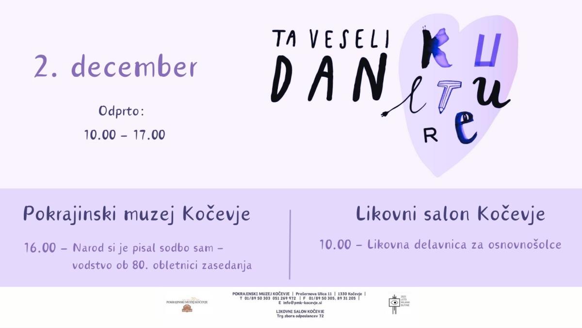 Ta veseli dan kulture je v Sloveniji postal neformalen praznik, ki ga obeležujemo 3. decembra, na dan rojstva pesnika Franceta Prešerna. Kulturne ustanove v tem času na stežaj odpremo vrata in ponudimo številne brezplačne dejavnosti. Tako smo tudi letos v Pokrajinskem muzeju Kočevje in Likovnem salonu Kočevje za vas pripravili poseben program. Ob 10. uri se bodo v Likovnem salonu odvijale likovne delavnice za osnovnošolce, ob 16. uri pa imamo za vas pripravljen voden ogled na temo Narod si bo sodbo pisal sam - ob 80. obletnici zasedanja.