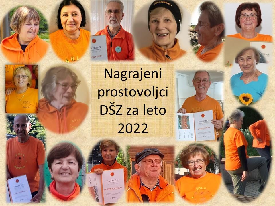 Društvo Šola zdravja (DŠZ) na svojem vsakoletnem zboru članov podeli nagrade in priznanja najbolj zaslužnim članom prostovoljcem društva za preteklo leto. Letošnje nagrade in priznanja so prejele osebe, ki izstopajo iz povprečja in prispevajo k viziji in poslanstvu Društva Šola zdravja, izražajo svojo pripadnost društvu in njegovemu delovanju, prispevajo k širitvi njegovega programa in njegovi promociji. Prejemniki nagrade za izjemne dosežke v letu 2022 so naslednji prostovoljci, člani Društva Šola zdravja: Dane Klepec (Dragatuš, občina Črnomelj), Metka Štok (Kranj – Prešernov gaj), Franc Habe (Domžale – drevored 88 lip) in Ana Podržaj (Ig), Milevka Jurković (Vrhnika), Ernest Sečen, (Brežice), Darinka Ban (Dravograd), Ana Ponikvar (Novo mesto – Birčna vas), Slavka Barbo (Novo mesto – Mali Slatnik), Marjanca Peklar (Novo mesto – Portoval 1), Jožica Farasin (Ruše – Bezena), Dragomir Mali (Sežana), Neža Kurnik (Hajdina – Slovenska vas), Marija Vehovec (Ljubljana – Vič), Marija Orešnik (Ljubljana - Brinje) in Erna Babnik (Ljubljana – Polje). Prejemnici priznanja Društva Šola zdravja pa sta: Ljuba Orel (Ljubljana – Koseški bajer) in Marija Tibaut (Čerensa, občina Črenšovci).