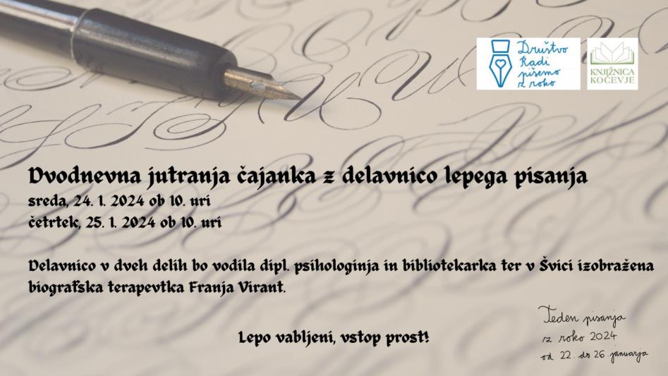 Knjižnica Kočevje vas lepo vabi na jutranjo čajanko z delavnico lepega pisanja v Tednu pisanja z roko (22. do 26. januar 2024), ki bo potekala v čitalnici naše knjižnice v sredo, 24. 1., in v četrtek, 25. 1., ob 10. uri.
