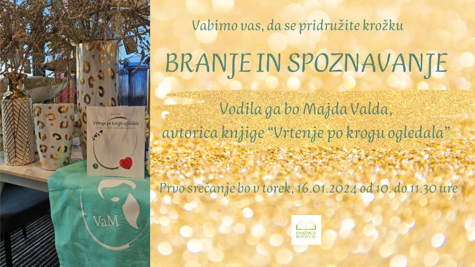 V mesecu januarju in februarju vas Knjižnica Kočevje vabi, da se pridružite krožku »BRANJE IN SPOZNAVANJE«, ki ga bo vodila Majda Valda, avtorica knjige »Vrtenje po krogu ogledala«. Knjigo lahko najdete tudi na knjižni polici v Knjižnici.