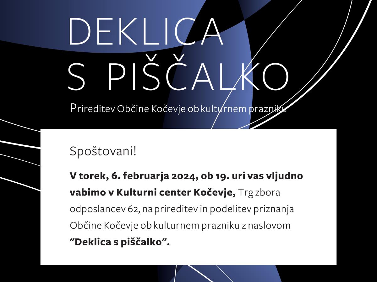 Deklica s piščalko je tradicionalna prireditev Občine Kočevje ob kulturnem prazniku, v sklopu katere se podeljuje istoimensko priznanje za strokovno odličnost na področju umetnosti, humanističnih znanosti in kulture. Letos bo podeljeno že 13. priznanje Deklica s piščalko.