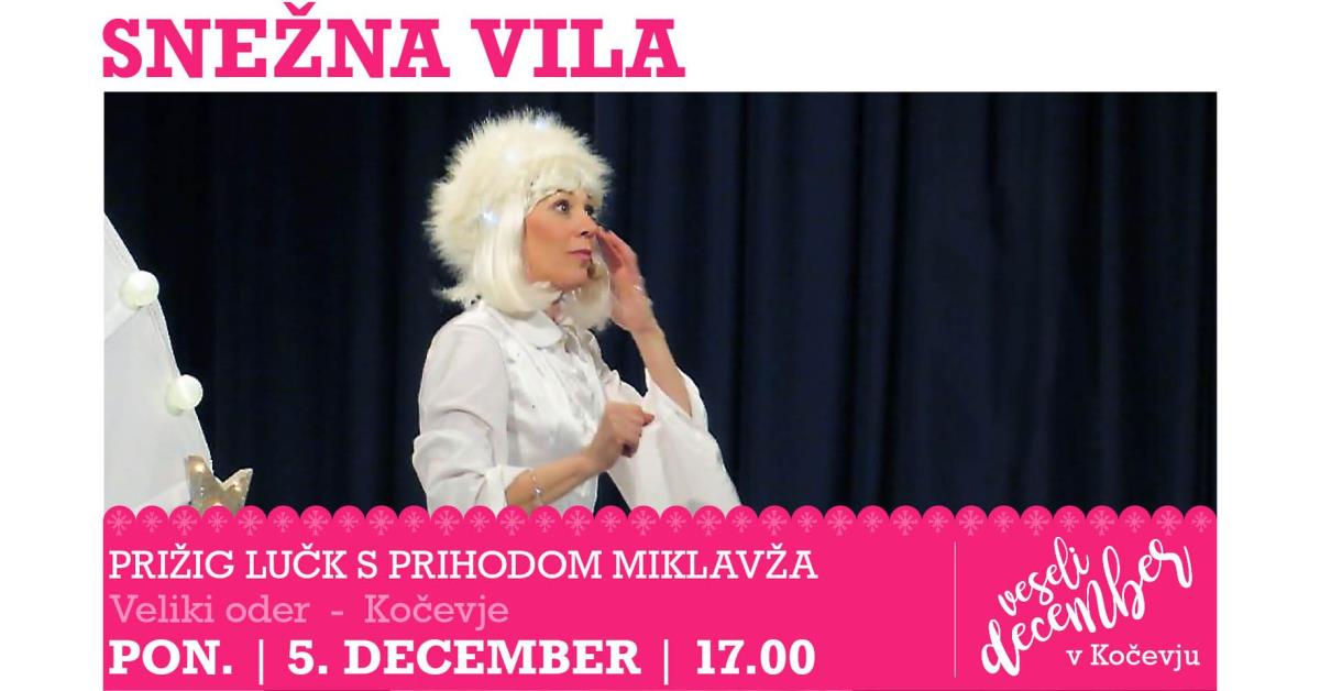 Predstavo Snežna vila je ustvarila Damjana Golavšek, v njej pa so zbrane pesmice o zimi, čarobnih bitjih in dobrih možeh, ki v prazničnem decembru obiščejo otroke. Zima je včasih muhasta. Ravno tedaj, ko vsi, še posebej otroci, pričakujemo sneg, ga noče in noče natrositi. Še dobro, da obstajajo pravljična bitja in Snežna vila, ki je doma na severnem tečaju. Pot k nam jo močno utrudi in ob nepravem času zadrema. Skupaj jo bomo zbudili, da bo pričarala sneg. Glasbena predstava z Damjano Golavšek bo na odru ustvarila pravo zimsko praznično vzdušje za prihod Miklavža.